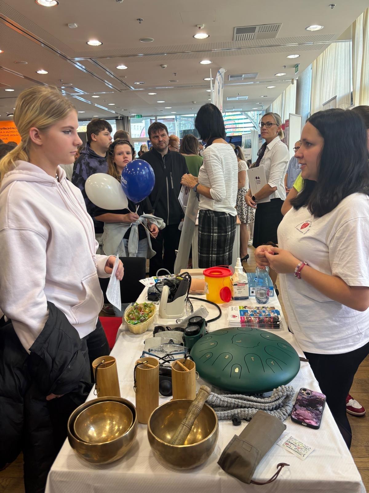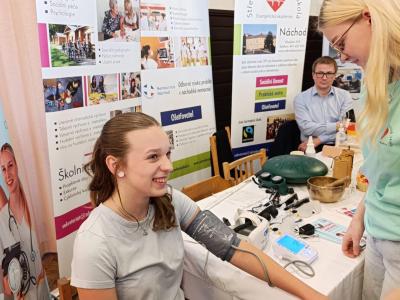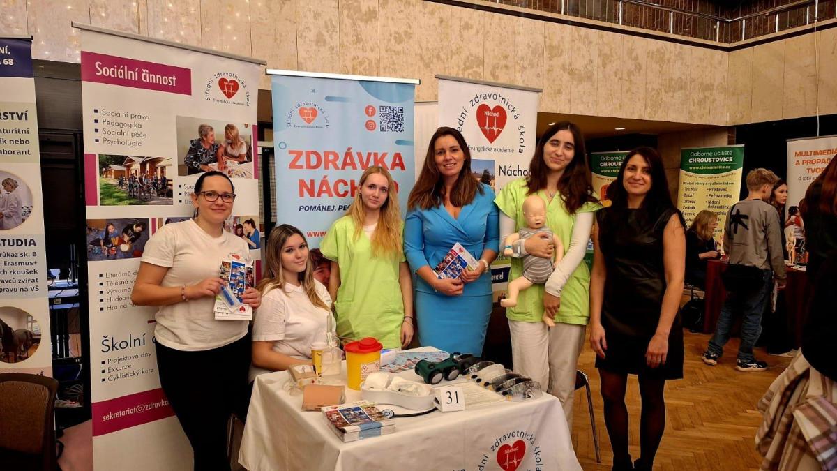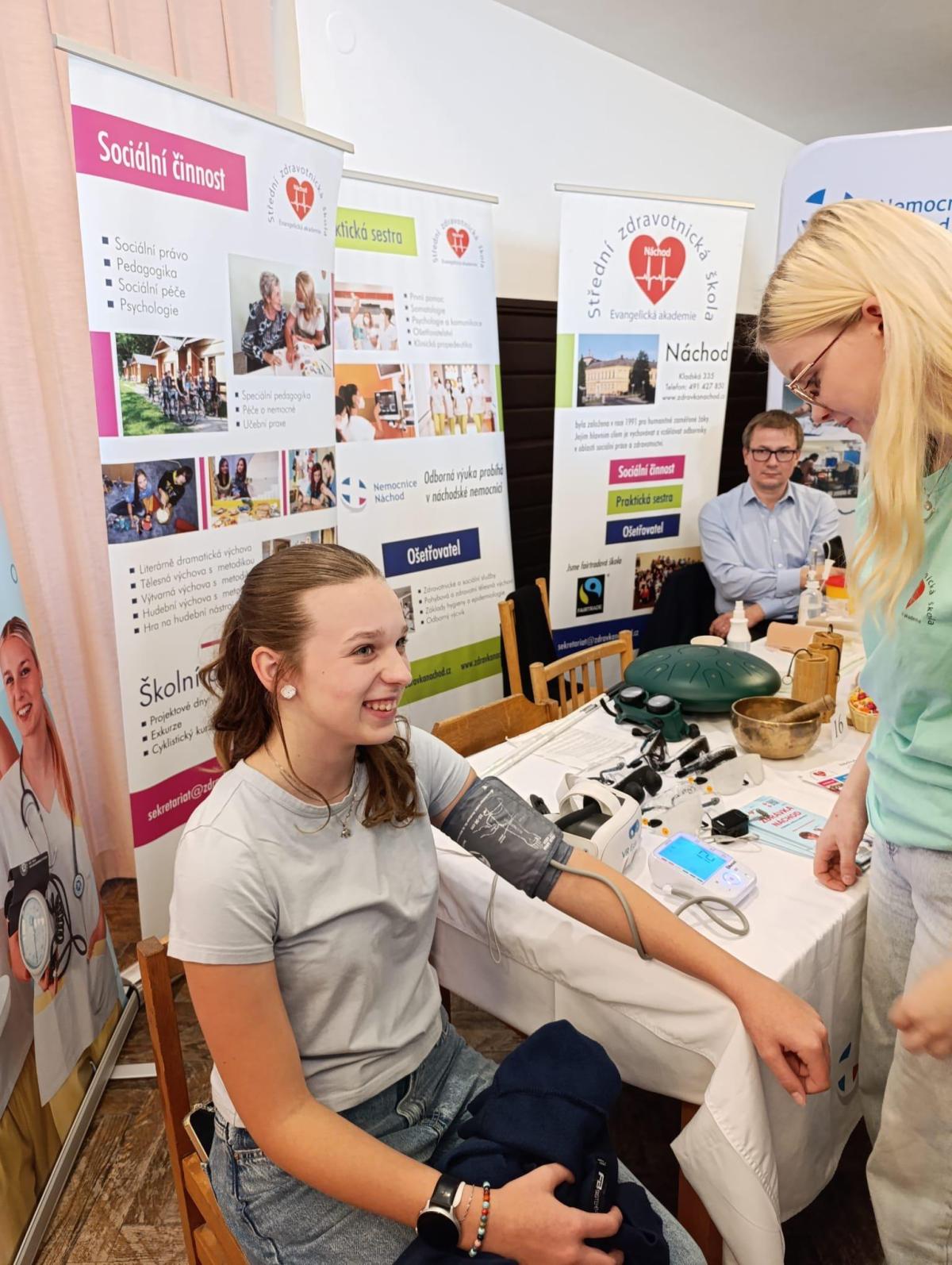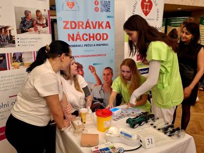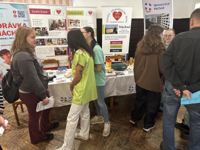 Návštěvníci se u našeho stánku zajímali nejen o obsah výuky, ale také o odbornou praxi, možnosti uplatnění i spolupráci s Oblastní nemocnicí Náchod a zařízeními sociálních služeb.