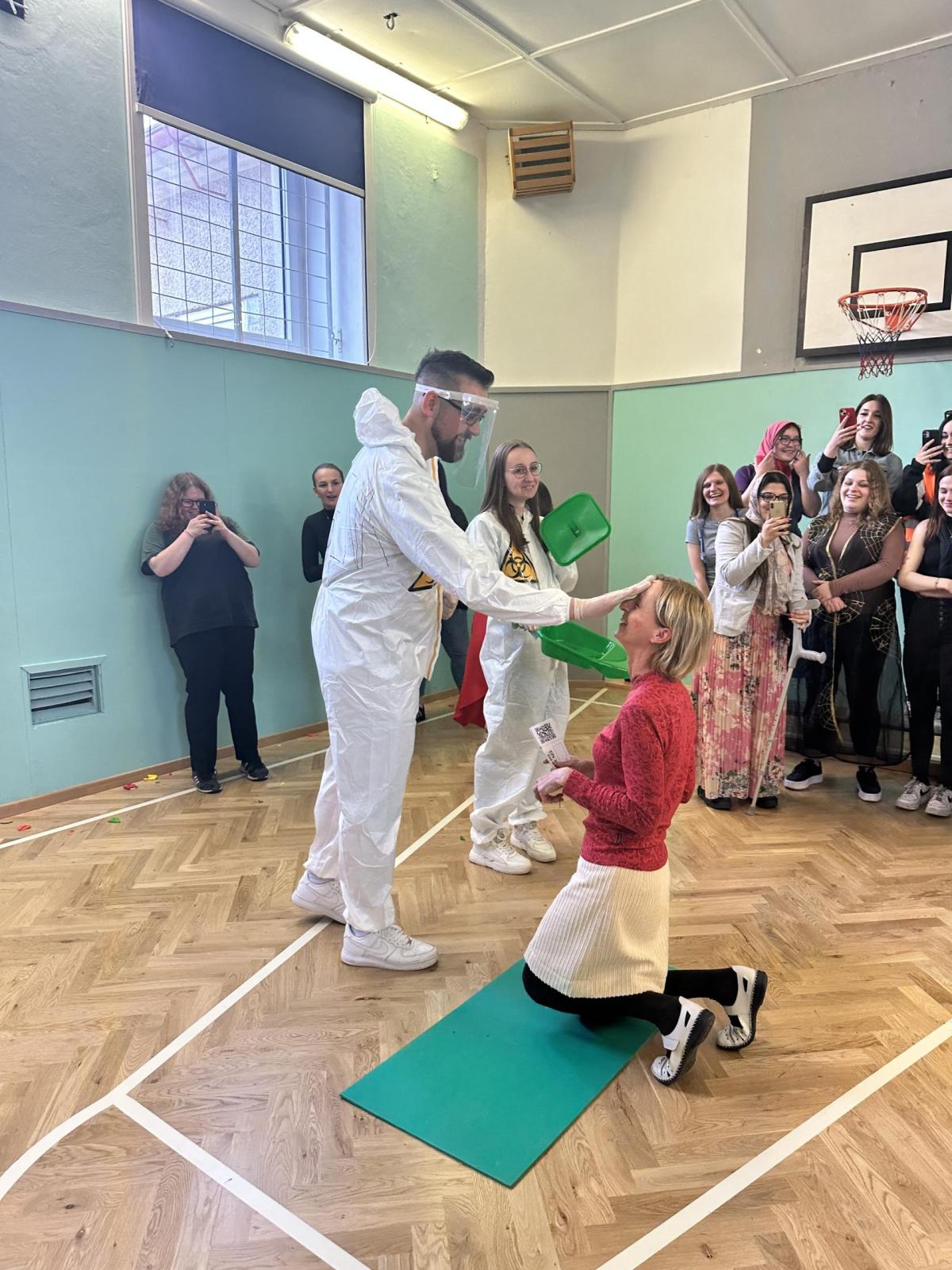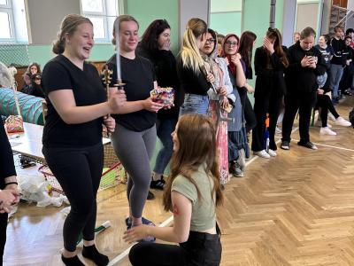 Součástí posledního zvonění bylo pasování žáků 3. ročníku oboru Sociální činnost do role maturantů. Maturanti jim připravili bohatý program a předali pomyslné žezlo maturant 2023/2024. Za žáky oboru praktická sestra převzala žezlo jejich třídní učitelka, neboť budoucí sestřičky aktuálně vykonávaly svou odbornou praxi v nemocnici. Dobrá zpráva pro naše praktikanty ze 3.Z: „I vy si své pasování užijete, a to v náhradním termínu!“