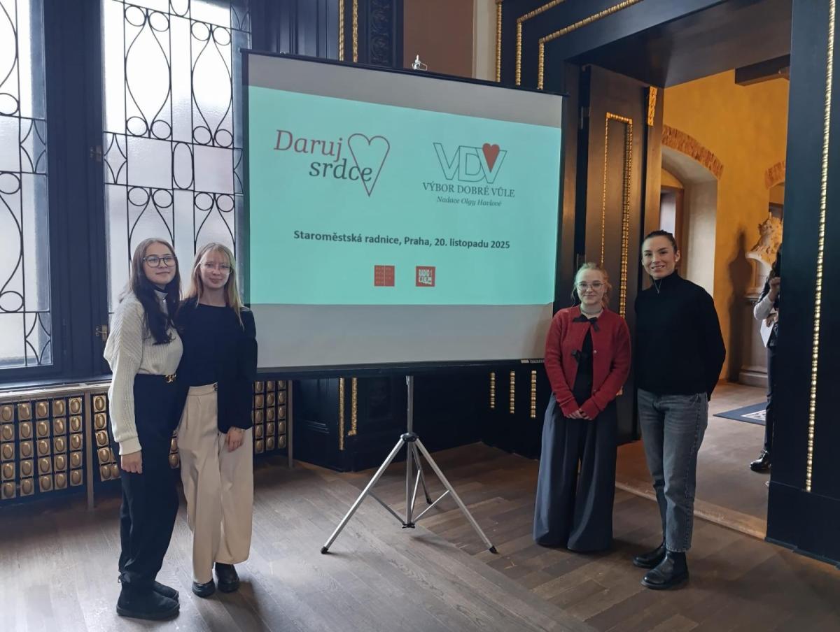 Ve čtvrtek 20. listopadu 2025 jsme se studenty třetího ročníku vyrazili do Prahy na slavnostní vyhlášení nejúspěšnějších studentských projektů, které v Brožíkově síni Staroměstské radnice pořádal Výbor dobré vůle – Nadace Olgy Havlové. Jednalo se již o šestý ročník této akce a naše škola se do výzvy zapojila podruhé.